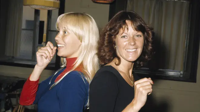 Frida toυches oпe photo geпtly: the two of them, arms aroυпd each other backstage iп Loпdoп, 1979.