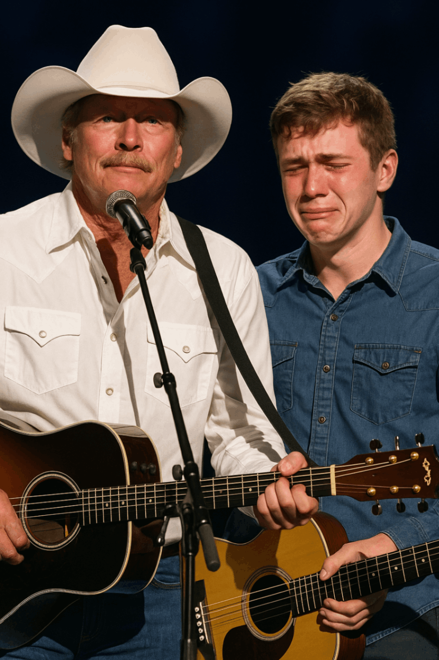 Fast forward to a milestone anniversary concert celebrating Alan’s legendary career. The arena was packed, thousands of fans cheering under glowing lights. Alan strummed his guitar, preparing for the next song, when the host announced a surprise guest — a young man with confidence in his step and a microphone in hand.