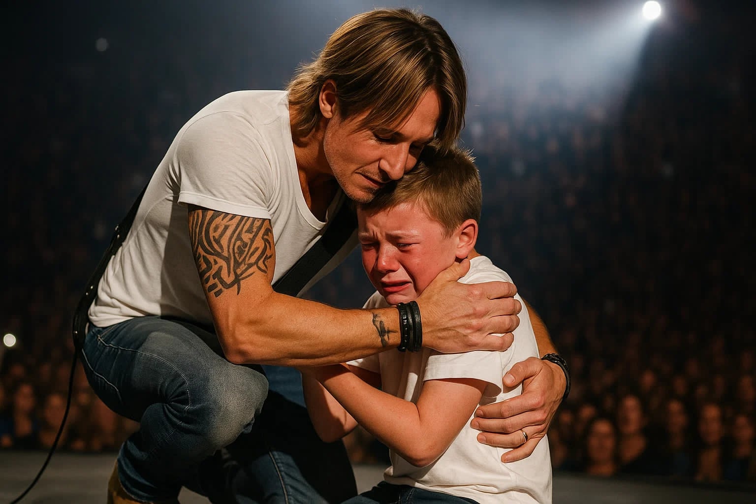 The audience erupted into applause as security helped Daniel climb onto the stage. The crowd — a sea of faces lit by phone screens — watched in complete awe. The boy, small and shy, wiped his tears as Keith kneeled beside him, speaking softly into his ear.